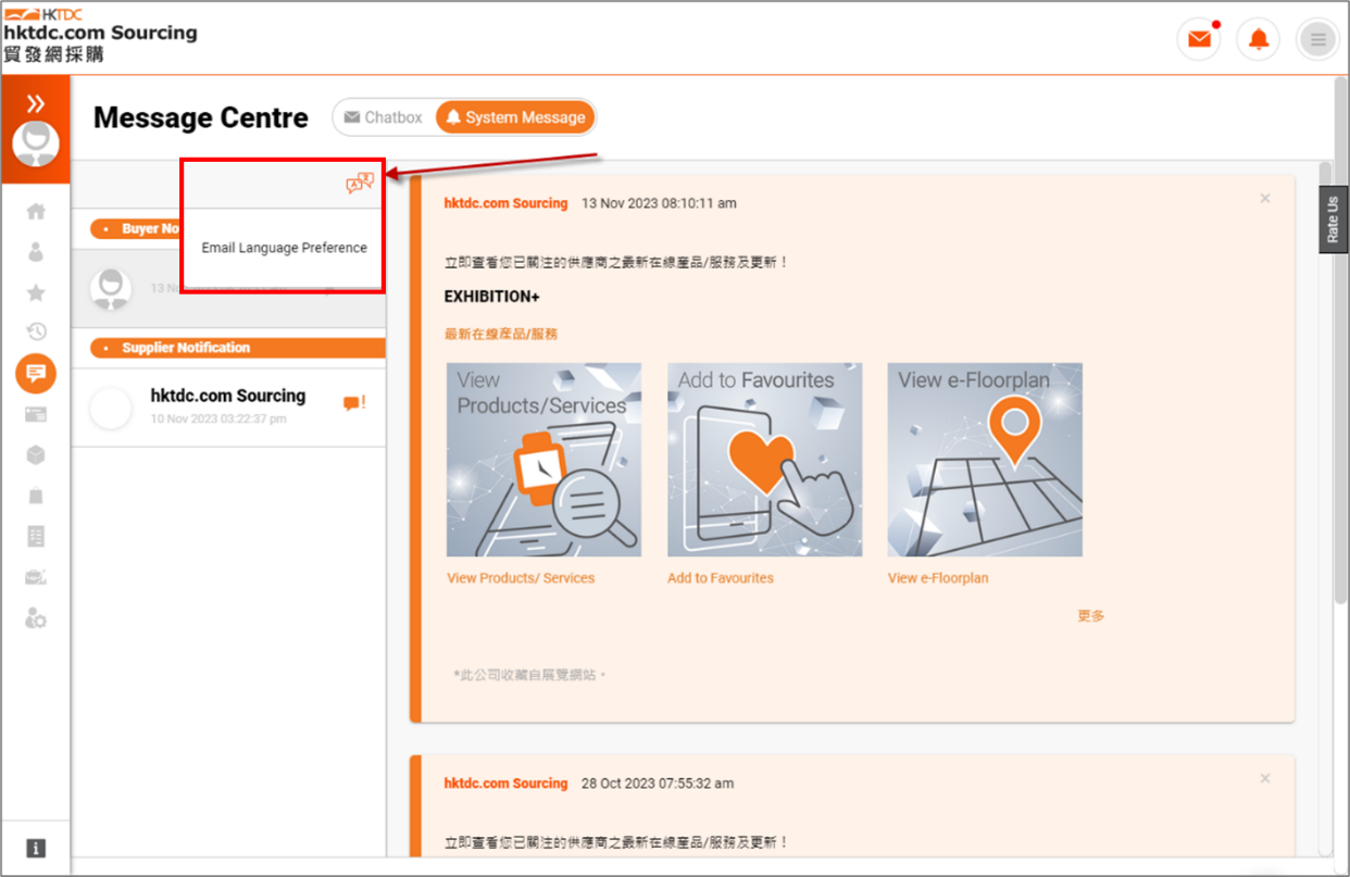 1. Visit the Message Centre after login and click on the “System Message” section. Then click on the “” button and select the “Email Language Preference” option.