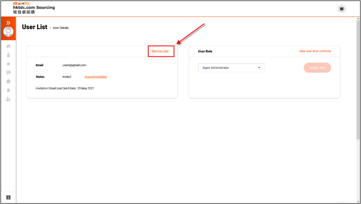 1. After login to “My Sourcing”, click on “User List” under “User Administration” in the left menu. You will be able to view the staff accounts under your company.