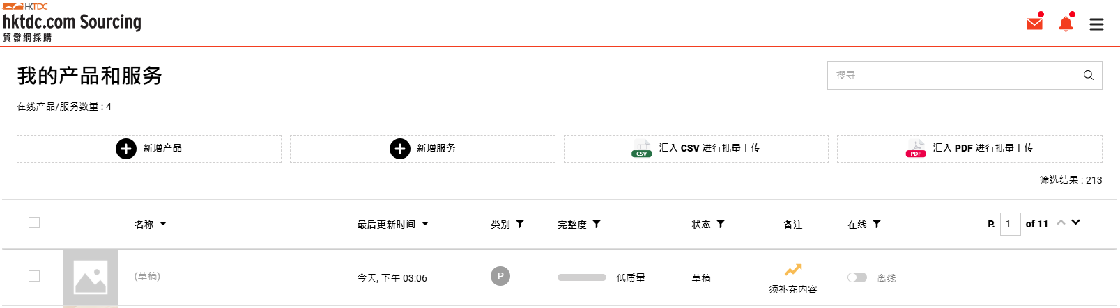 要一次上传多个产品/服务的资料,请登入供应商帐户概览,并在左侧的导航列点击 「产品和服务」。