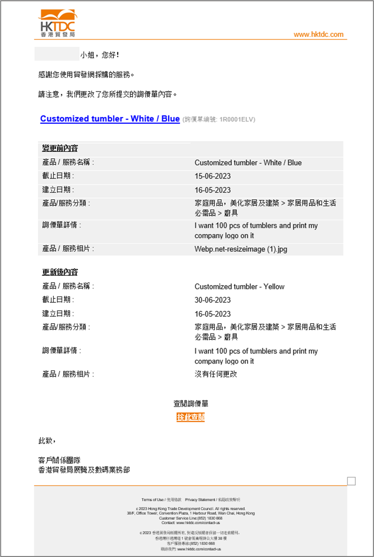 当管理员完成修改后,系统将会给您发送电邮,告知您的询价单已被编辑,并说明哪些内容已被修改。