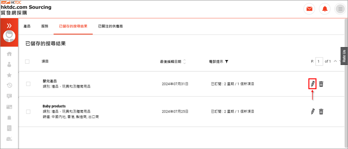 1. 若您想暂时停止订阅新产品或服务的电邮提示通知。您可以在「储存搜寻结果」页面中点击「」按钮并取消勾选电邮提示设定的方格。