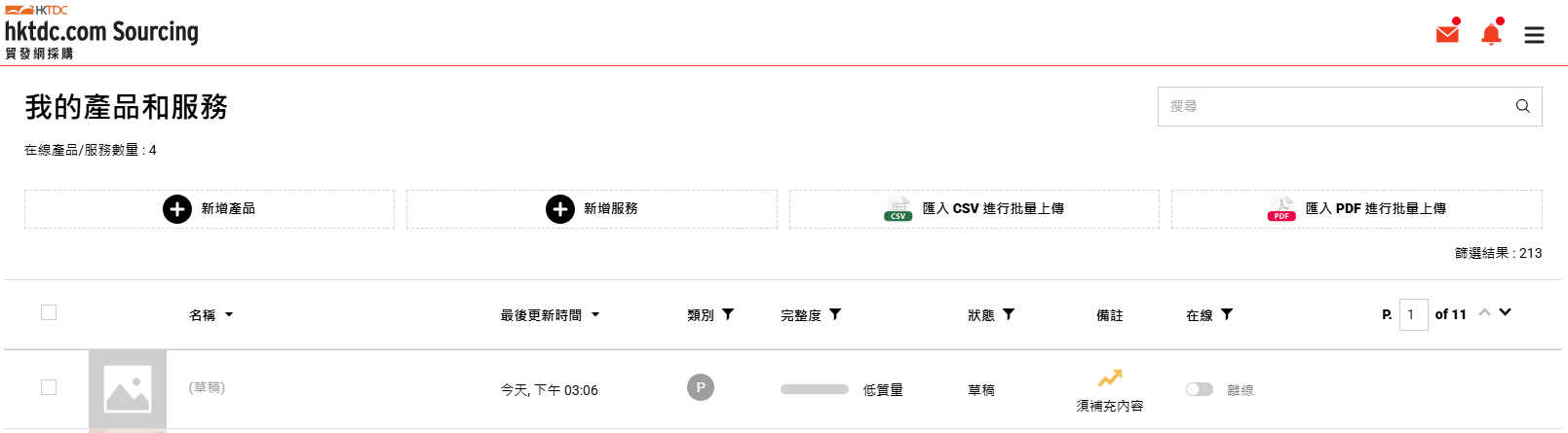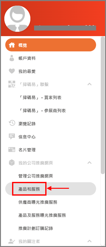 要一次上傳多個產品/服務的資料,請登入供應商帳戶概覽,並在左側的導航列點擊 「產品和服務」。
