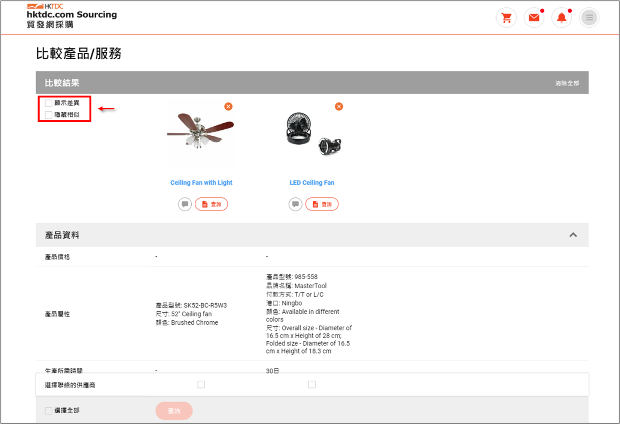 4. 產品/服務/供應商的比較結果將以列表形式呈現。您亦可以點擊列表左上角的「顯示差異」和「隱藏相似」按鈕,進一步顯示結果的不同之處。