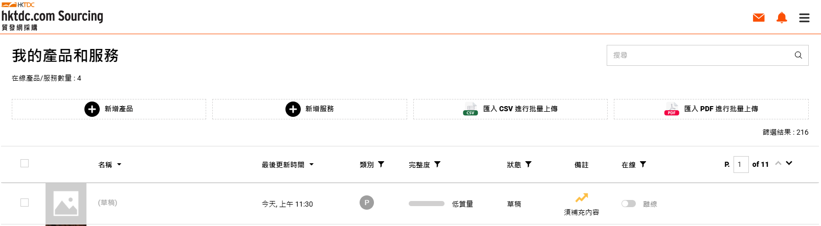 登入「我的採購」,打開左側選單,然後點擊「我的公司推廣網頁」部分下的「產品和服務」以上傳新產品/服務。